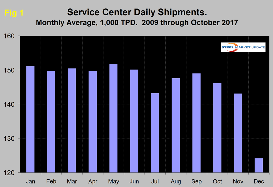 Total daily carbon steel shipments increased from 144,400 tons in September to 147,200 tons in October. MSCI data is quite seasonal, and we need to eliminate that effect before commenting in detail on an individual month’s result. Figure 1 demonstrates this seasonality and why comparing a month’s performance with the previous month can be misleading, particularly in July and the fourth quarter of the year. We can expect shipments to decrease in the final two months of the year. In the commentary below, we report year-over-year changes to eliminate seasonality and provide an undistorted view of market direction.