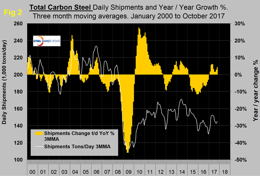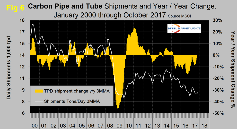 Figure 2 shows the long-term trend of daily carbon steel shipments since 2000 as three-month moving averages. (In our opinion, the quickest way to size up the market is the brown bars in Figures 2, 3, 4, 5 and 6, which show the percentage year-over-year change in shipments by product.) In January, on a 3MMA basis, there was positive year-over-year growth of 0.07 percent, which improved to 6.2 percent in April before declining to positive 1.58 percent in July and recovering to 4.27 percent in October. These were the first positive year-over-year results since February 2015.