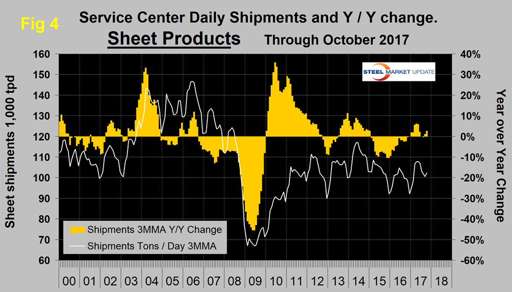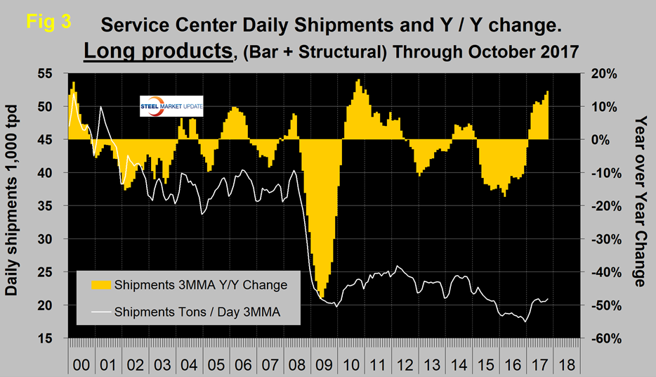 Figure 3 shows monthly long product shipments from service centers as a 3MMA with year-over-year change. Growth has improved this year and is now the highest it has been since late 2010. The seven months through October all exceeded a 10 percent year-over-year growth rate on a 3MMA basis, and in the latest data growth was 14.6 percent.