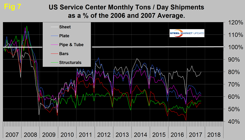 In 2006 and 2007, the mills and service centers were operating at maximum capacity. Figure 7 takes the monthly shipments by product and indexes them to the average for 2006 and 2007 in order to measure the extent to which shipments of each product have recovered. Each year, all products experience the December collapse and January pickup. In October, the total of carbon steel products was 69.3 percent of the average monthly shipping rate that occurred in 2006 and 2007. Structurals and bar were 56.3 percent and 54.7 percent, respectively. Sheet was at 79.9 percent, plate at 61.9 percent and tubulars at 60.8 percent.