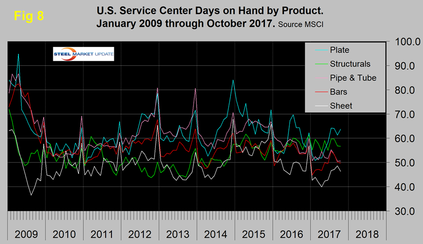 March closed with months on hand, (MoH) of 1.94 for all carbon steel products, which was the lowest level in 13 years (since August 2004). This anomaly partly resulted from 23 shipping days, which is the maximum that ever occurs. We have now removed that effect as described above. Compared to the end of October last year, total carbon steel inventories were up slightly from 49.0 to 49.1 days on hand (DoH). On a tonnage basis, total carbon steel inventories at the end of October were up by 6.0 percent year over year, but down by 14.6 percent compared to the end of October 2015. Compared to 2016, all products except tubular goods had an inventory tonnage increase. Figure 8 shows the DoH by product monthly since October 2009.