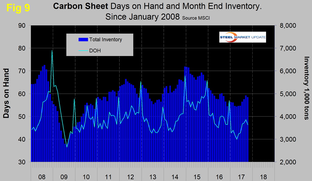 Figure 9 shows both the month end inventory and days on hand since October 2008 for total sheet products. In the last three years, both the year end spikes and the mid-year troughs of sheet inventory tonnage have been declining.