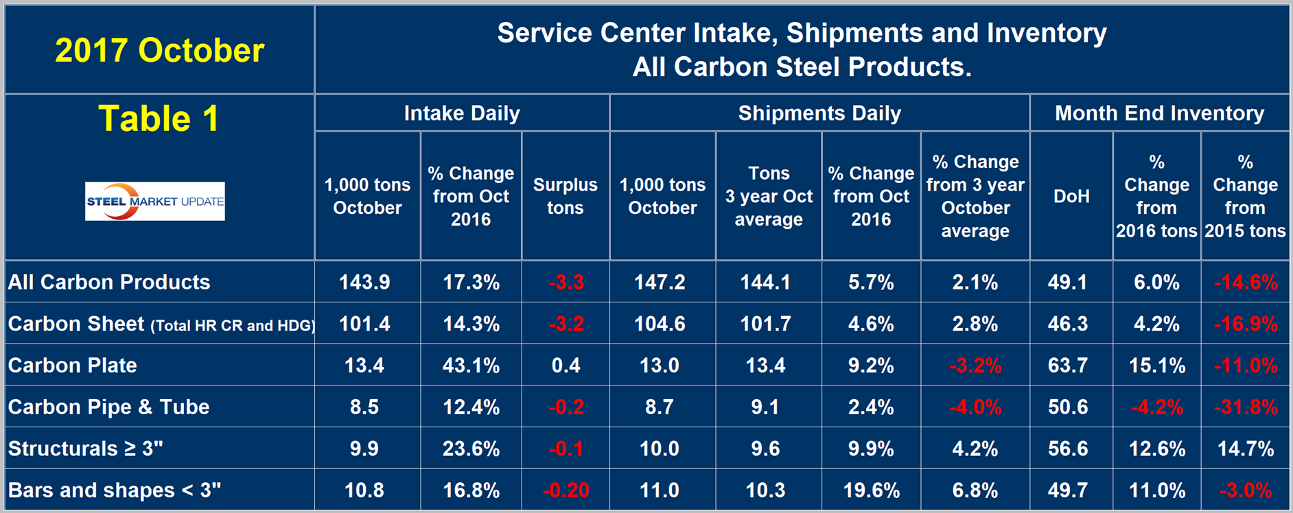 Service center shipments in October exceeded expectations, led by long products and plate, according to Steel Market Update’s analysis of Metals Service Center Institute data.