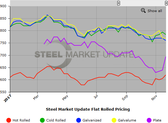 Flat rolled and plate steel prices are all over the place this week. We are seeing a distinct difference in pricing from those mills who still have November and December tonnage compared to those whose lead times are into January and beyond. Hot roll appears to be the strongest product with virtually all of our HRC price sources advising that prices are firm at $600 per ton and higher. The weakest products appear to be galvanized and cold rolled. However, when you take into consideration the wider-than-historical spread between hot rolled base prices and that of cold rolled and coated (up to $200 per ton instead of $100-$140 per ton), there is room to move, and that may be what we are seeing now.