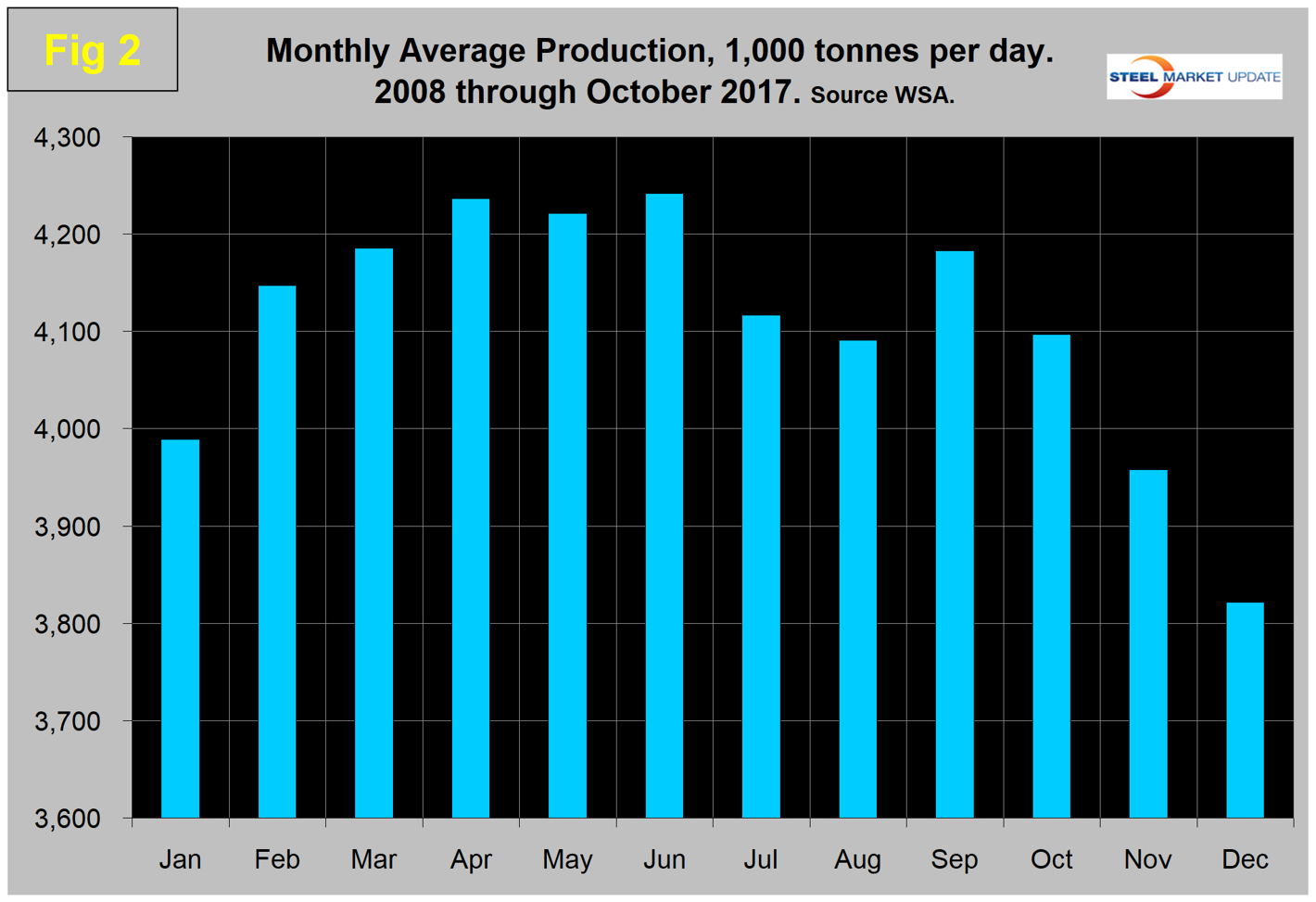As we dig deeper into what is going on, we start with seasonality. Global production has peaked in the early summer for the last seven years with April and June on average having the highest volume. Figure 2 shows the average tons per day production for each month since 2008. In those 10 years on average, October has been down by 2.1 percent; this year October was down by 0.7 percent.