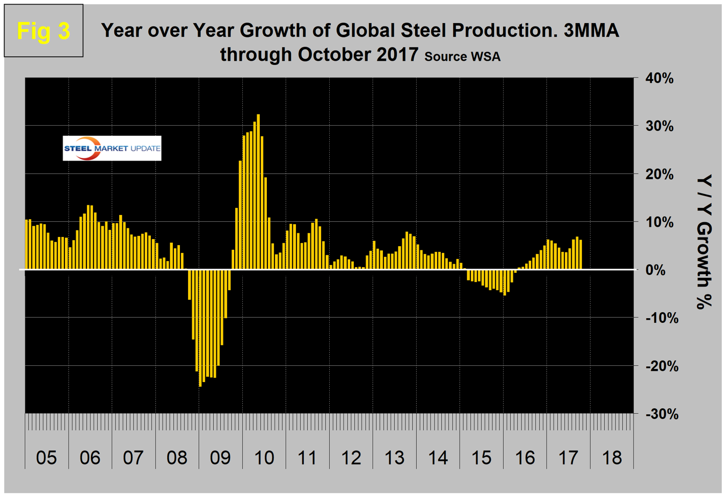 Figure 4 shows China’s production since 2005 and Figure 5 shows the year-over-year growth. China’s production, after slowing for 13 straight months, returned to positive growth each month from May 2016 through October this year. Evidently, the production in Chinese induction furnaces, which were shut down by government mandate this year, was illegal and the output from these furnaces was mostly unreported. This production has been shifted to the mainstream producers where it is recorded, artificially increasing the official output. Platts reported that Tangshan, China’s biggest steelmaking city located in the north, began well-publicized steel output cuts on Nov. 15. This is an attempt to improve air quality in Beijing, Tianjin and 26 surrounding cities.