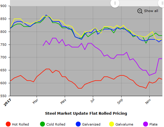 SMU Note: Below is a graphic showing our hot rolled, cold rolled, galvanized, Galvalume, and plate price history. To use the graph’s interactive capabilities, you must view it on our website here. If you need help navigating the website or need to know your login information, contact us at info@SteelMarketUpdate.com or 800-432-3475.