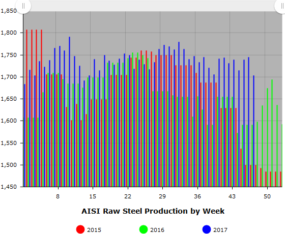 Below is a graph showing the history of weekly raw steel production. You will need to view the graph on our website to use its interactive features, you can do so by clicking here. If you need assistance logging into or navigating the website, please contact our office at 800-432-3475 or info@SteelMarketUpdate.com.