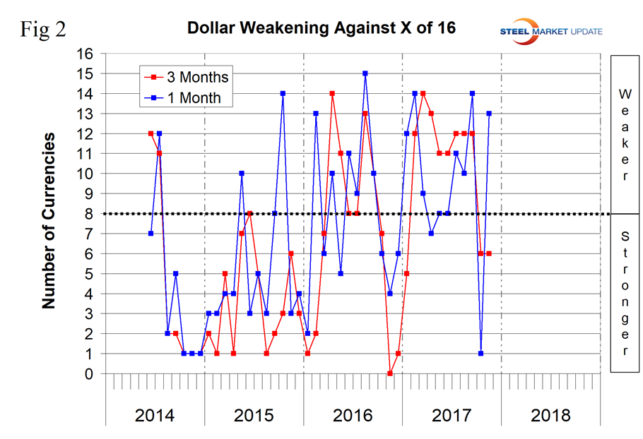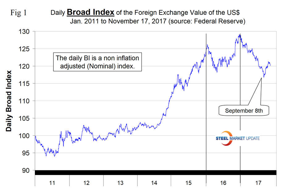 The broad index value of the U.S. dollar has strengthened since Sept. 8, but in the last month the dollar has weakened against 13 of the 16 steel trading nations’ currencies.