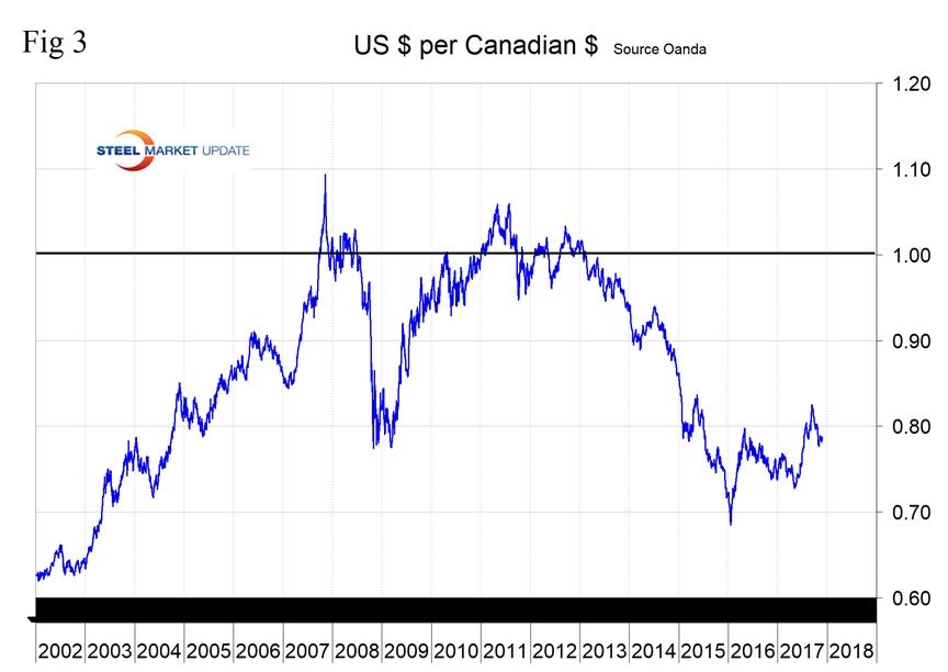 The Canadian Dollar has weakened by 1.8 percent in the last three months. On Nov. 1, Dean Popplewell, a currency analyst wrote: “Canada’s economy contracted in August, surprising the markets, which had expected a small gain. The decline of 0.1 percent was the first drop since October 2016. The soft reading has pushed USD/CAD above the 1.29 line at the start of the North American session. The Canadian dollar is on the verge of dropping to a 10-week low, and has endured a miserable October, slipping some 3.5 percent. There were no surprises from the Bank of Canada last week, as the Bank maintained the benchmark rate at 1.00 percent. In its rate statement, the Bank noted that wage growth levels remain weak, as there is slack in the labor market. Inflation pressure from wage growth remains muted, but the Bank did not provide a reason why inflation levels are so low. This problem is apparent south of the border as well, where a robust U.S. economy and red-hot labor market has not translated into higher inflation. The cautious tone of the BoC did not impress investors, and the Canadian dollar shed close to 1.0 percent on Wednesday after the rate announcement.” Figure 3 shows the value of the C$ in U.S. dollars since January 2002. On Nov. 25, the C$ was worth 79 U.S. cents.