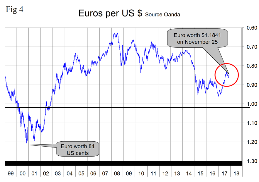 The Euro has appreciated by 0.5 percent in the last month. Figure 4 shows the value of the euro in U.S. dollars since its inception in 1999. On Nov. 25, the euro was worth 1.1841 U.S. dollars. Mark Chandler, who publishes almost daily currency commentaries, wrote on Nov. 23: “The euro is edging higher to trade at its best levels since the middle of last month. It is drawing closer to the $1.1880 area, which if overcome, could point to return to the year’s high seen in early September near $1.2100. There is a combination of factors lifting the euro. The recent data, including yesterday’s flash PMI, suggests that the regional economy is re-accelerating here in Q4. Today’s German IFO survey provides corroboration. The assessment of the overall business climate rose to a new record high of 117.5 from an upwardly revised 116.8. The breakdown showed that even though the assessment of the current economy eased a touch, the improved expectations more than offset it.”