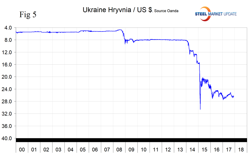 The Ukranian Hryvnia: Figure 5 shows the relationship between the hryvnia and the U.S. dollar. The hryvnia has appreciated by 0.8 percent in the last month, but is down by 5.3 percent in three months. In 2016, Ukraine was the 10th largest steel producer of all nations at 24.2 million metric tons, of this 71.7 percent was produced in basic oxygen furnaces. In 2016, Ukraine was the 7th highest tonnage exporter when it shipped 18.2 million metric tons to other nations. Through mid-November, Ukraine had shipped 222,592 metric tons of all steel products to the U.S. putting it in 25th place.