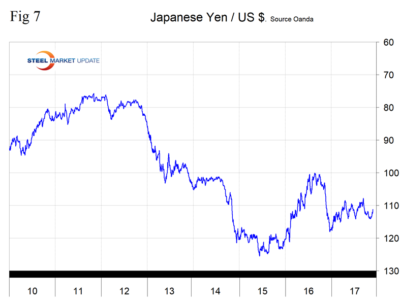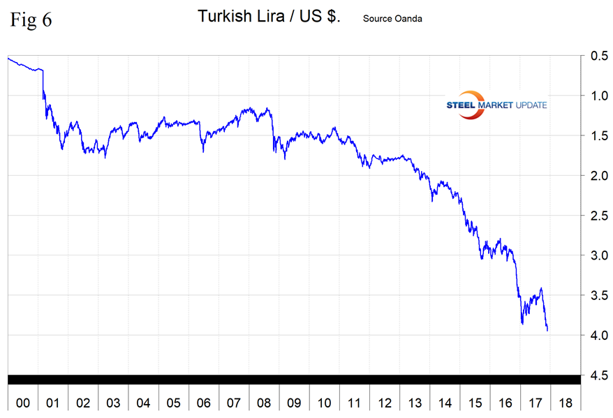 The Turkish Lira: Figure 6 shows the relationship between the lira and the U.S. dollar. 2017 has been an erratic year for the lira. From Jan. 27 to Sept. 10, the lira appreciated by 13.6 percent. Since then the lira has gone into free fall and depreciated by 13.1 percent. In 2016, Turkey was the 8th largest steel producer of all nations at 33.2 million metric tons, of this 65.9 percent was produced in EAFs. In 2016, Turkey was the 10th highest tonnage exporter when it shipped 17.0 million metric tons to other nations. Through mid-November, Turkey was the 7th major exporter to the U.S. with 1,925,954 metric tons.