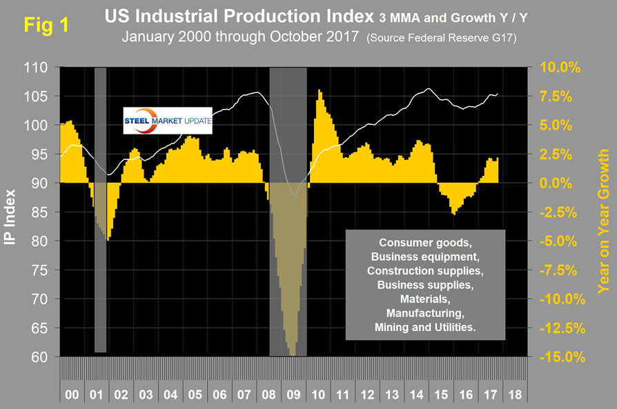 SMU Comment: The ISM index, which we give the most credence, is at its strongest level since April 2011 and signaling expansion. This is the only leading indicator examined in this update. Auto assemblies and supplier industries are slowing in NAFTA, and the U.S. and Canada are losing share to Mexico. Manufacturing has added 138,000 jobs this year through October, but there has been virtually no productivity improvement in the last four quarters. The industrial production index and new orders for durable goods have positive growth. On balance, these seven measures are positive and portend well into the first quarter of 2018.
