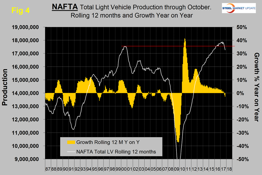 On a rolling 12-month basis year over year through October, LV production in NAFTA decreased by 2.7 percent. September declined by 1.5 percent. These were the first months of contraction since May 2010. There has been a very gradual slowdown in growth for the last three years as indicated by the brown bars in Figure 4. The data source is Ward’s Automotive. We understand that the main hang-up in the NAFTA negotiations revolves around auto parts manufacture and final point of assembly. There is a huge movement of components and subassemblies in both directions across the southern border, therefore it is not known whether the Ward’s data exaggerates or deflates the national differentials.