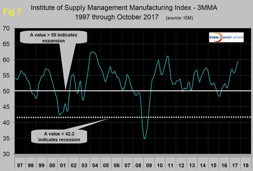 The ISM Manufacturing Index is a diffusion index. The Institute of Supply Management states that “diffusion indexes have the properties of leading indicators and are convenient summary measures showing the prevailing direction of change and the scope of change. An index value above 50 percent indicates that the manufacturing economy is generally expanding; below 50 percent indicates the opposite.” Figure 7 shows the 3MMA of the ISM index from January 1997 through October 2017 with an improving trend since January 2016. In October, the 3MMA of the index at 59.43 was the highest since April 2011.