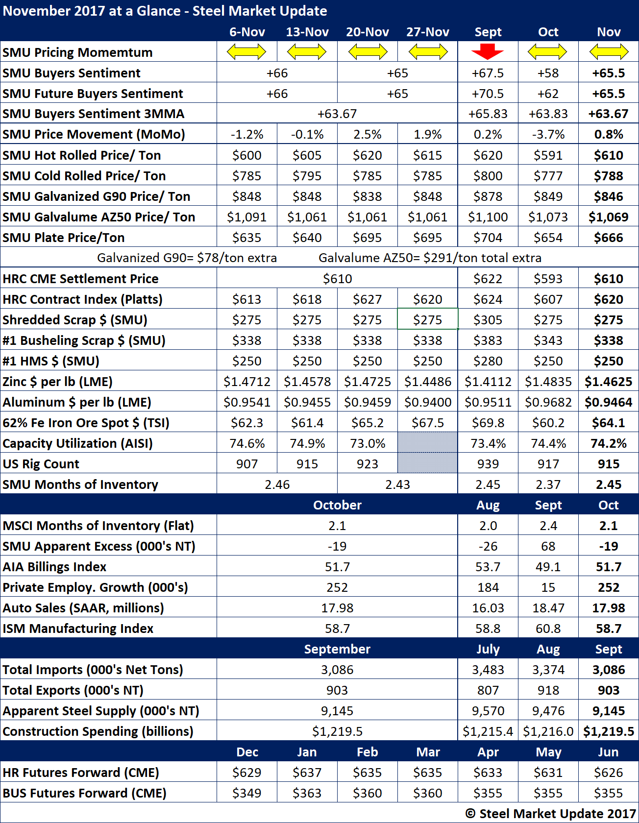 Flat rolled steel Price Momentum ended the month as it began, pointing to a sideways or “mixed” market. Our flat rolled steel price indices averages over the past three months show very little movement in steel prices. Benchmark hot rolled averaged $610 per ton, which is actually lower than the $620 average we saw at the end of September. Prices are up “modestly” compared to October when the latest round of price increases began.