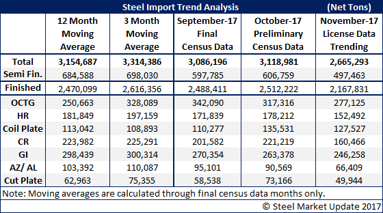Imports of foreign steel will be much lower in November than at any time since April 2016. Based on the most recent license data released on Tuesday, Nov. 28, imports will be approximately 2.6 million tons. This is down from 3.1 million tons in October and is also less than the 2.8 million tons imported last November.