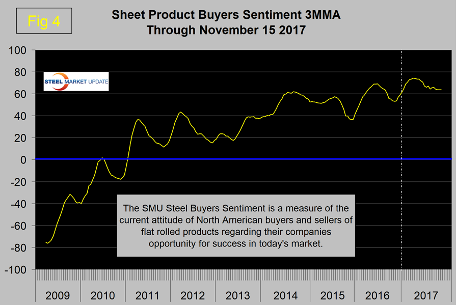 The steel buyer’s sentiment reversed direction in October and trended negative. It continued to decline slightly in November when it reached 63.67 at mid-month, but is still historically very strong (Figure 4).
