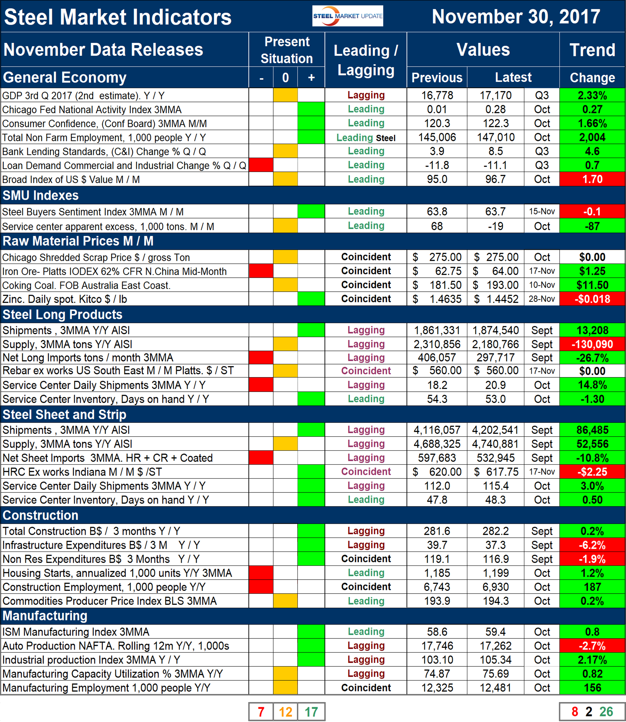 There was a generally positive shift in raw materials prices when iron ore and coking coal both reversed direction positively and scrap was unchanged. The price of zinc declined slightly from its very high October value. We regard rising raw materials prices as positive and indicative of a strengthening market. In the long steel products sector, there was an improvement in shipments, and the price of rebar, ex works U.S. South East, was unchanged after declining in October. There were no changes in the trends for sheet products in the November data when five of the six indicators trended positive. This was an improvement from three positives in the August data. In the construction sector there was one trend reversal when the value put in place reversed direction and improved. There were no trend changes in the manufacturing sector where four of the five indicators were trending positive in October and November. The only negative was a decline in automobile assemblies in NAFTA.