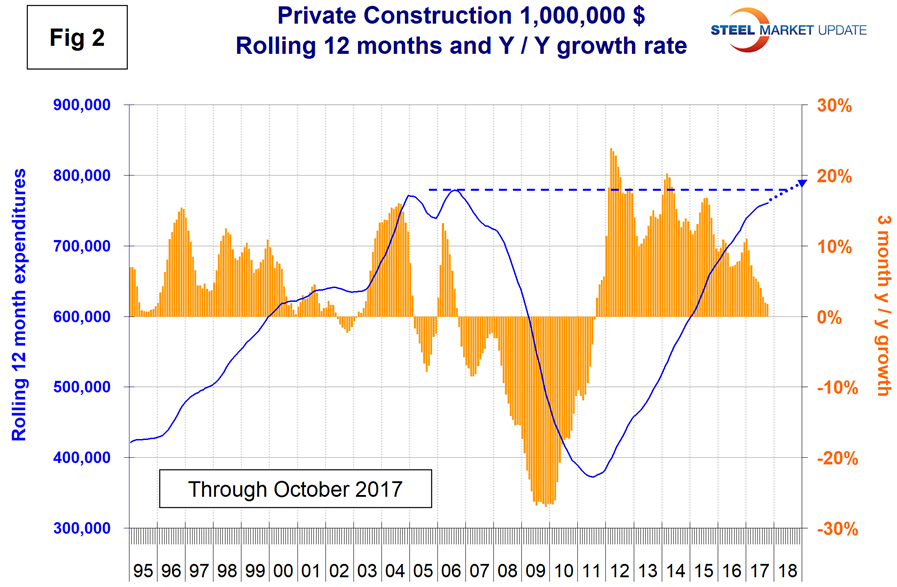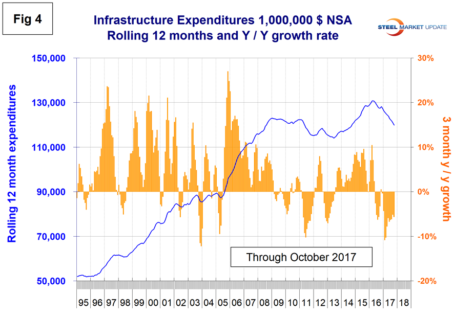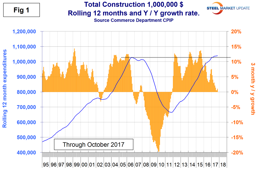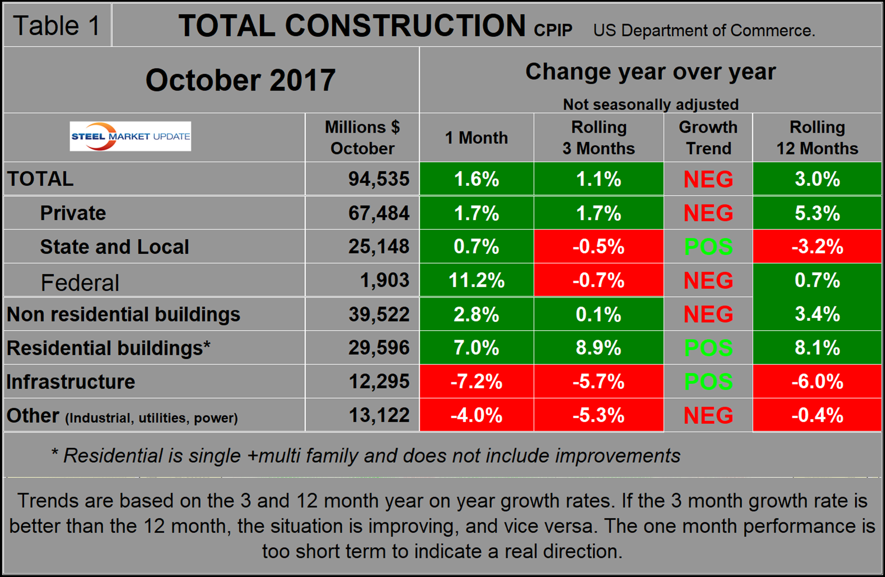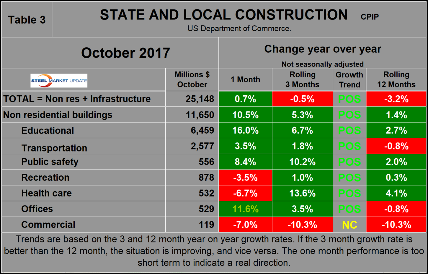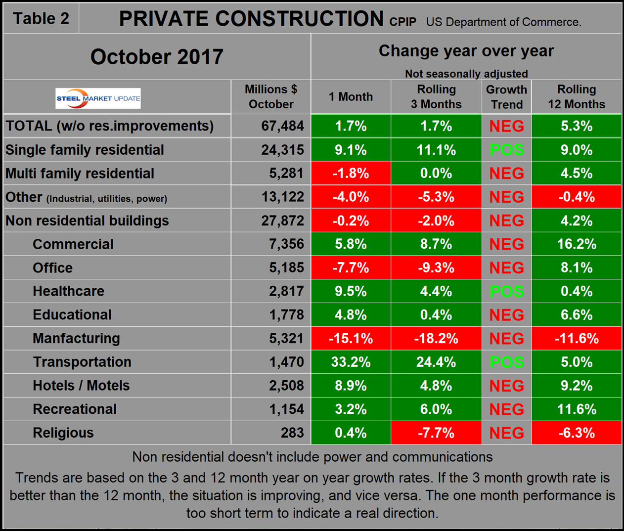 The official CPIP press release gives no appreciation of trends on a historical basis and merely compares the current month with the previous one on a seasonally adjusted basis. The background data is provided as both seasonally adjusted and non-adjusted. The detail is hidden in the published tables, which SMU tracks and dissects to provide a long-term perspective. Our intent is to provide a route map for those subscribers who are dependent on this industry to “follow the money.” This is a very broad and complex subject, therefore to make this monthly write-up more comprehensible, we are keeping the information format as consistent as possible. In our opinion, the absolute value of the dollar expenditures presented is of little interest. What we are after is the magnitude of growth or contraction of the various sectors. In the SMU analysis, we consider only the non-seasonally adjusted data. We eliminate seasonal effects by comparing rolling three-month expenditures year over year. CPIP data also includes the category of residential improvements, which we have removed from our analysis because such expenditures are minor consumers of steel.