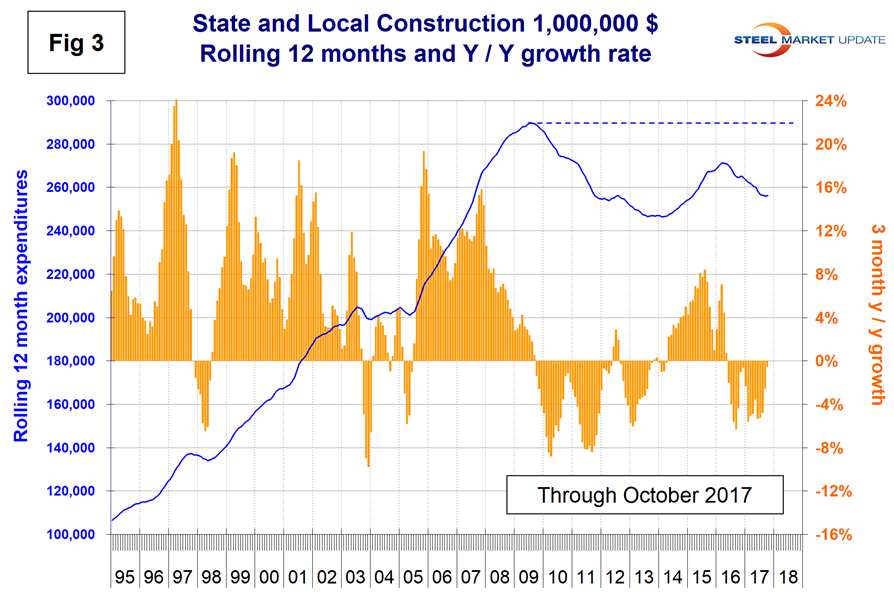 The overall figure includes both nonresidential buildings and infrastructure. April 2016 was the last month in which S&L expenditures had positive year-over-year growth. Figure 3 shows growth as the brown bars and the rolling 12-month expenditures as the blue line. Nonresidential buildings expanded by 5.3 percent in three months through October, which was the best result since March last year. Total S&L nonresidential buildings slumped in the period Nov. 16 through April 17, therefore SMU’s year-over-year comparisons will probably look good for the next few months. Educational buildings are by far the largest subsector of S&L nonresidential at $6.46 billion in October and experienced 6.7 percent growth on a rolling three months basis with positive momentum.