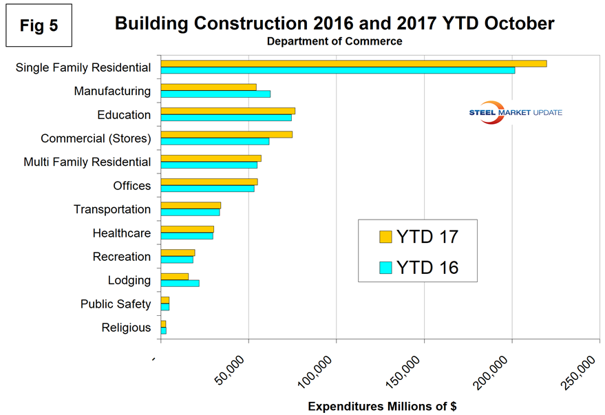Figure 5 compares year-to-date expenditures for building construction for 2016 and 2017. Single-family residential is dominant and in the 12 months of 2016 totaled $243 billion, up from $233 billion in 2015. On a rolling 12-month basis through October 2017, single-family residential expenditures were $260.6 billion. It seems likely that if the Senate version of the tax bill prevails and mortgage interest and local tax deductions are eliminated, then housing construction will be severely affected.