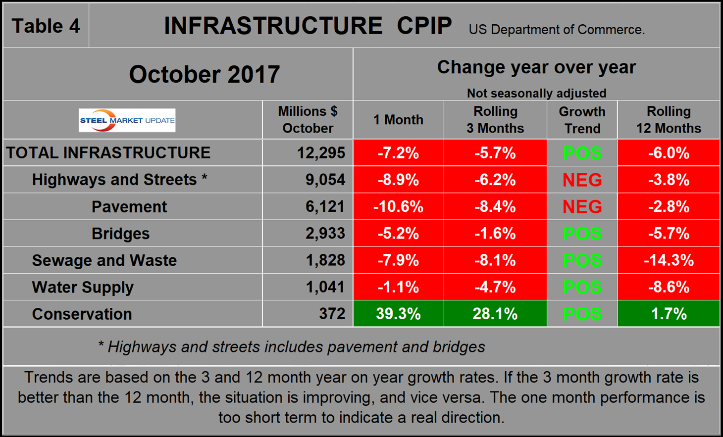At SMU, we analyze the CPIP data with the intent to provide a clear description of activity we believe accounts for about 45 percent of total U.S. steel consumption. See the end of this report for more detail on how we perform this analysis and structure the data. Note that we present non-seasonally adjusted numbers. Much of what you will see in the press may differ from our presentation because others base their comments on adjusted values. Our rationale is that construction is highly seasonal and our businesses function in a seasonal world. Also, we don’t understand how the adjustments are made, nor do we trust them.