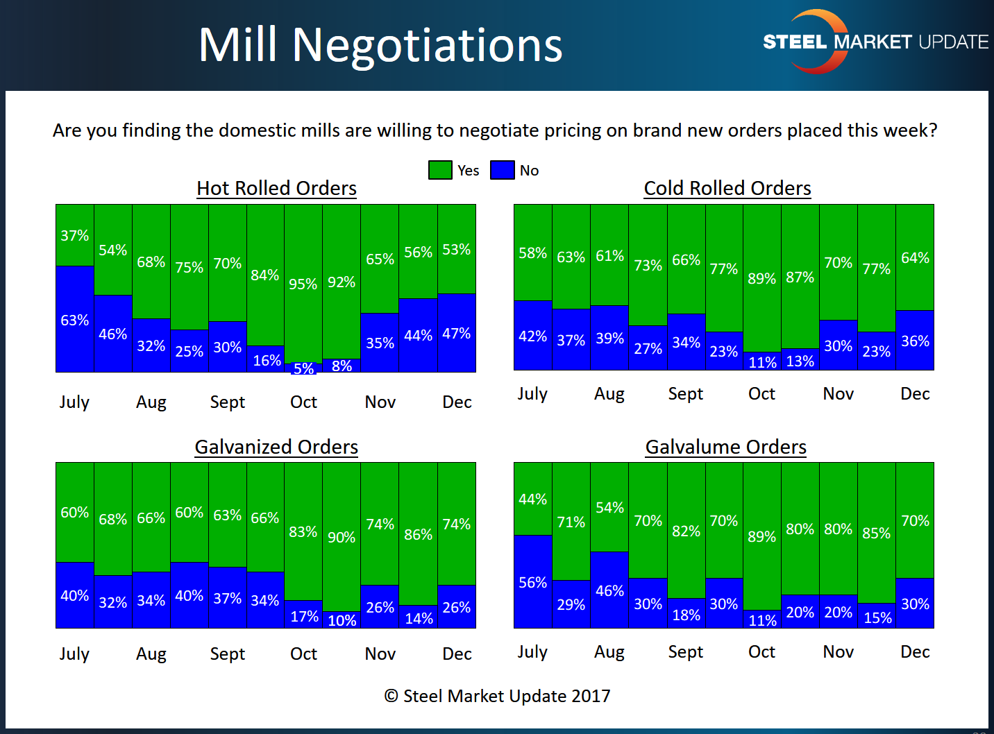 Looked at it from the opposite perspective, nearly half (47 percent) of hot roll buyers say the mills are unwilling to negotiate pricing on new orders today, about a third (36 percent) of cold roll buyers and a third (30 percent) of Galvalume buyers report mills holding the line, while only about a quarter (26 percent) of galvanized buyers report that the mills just say no.