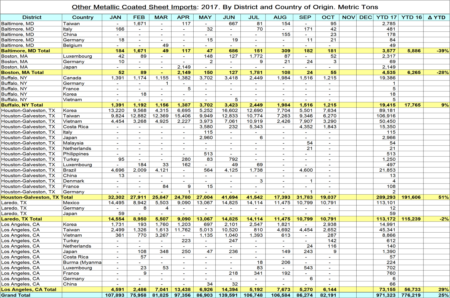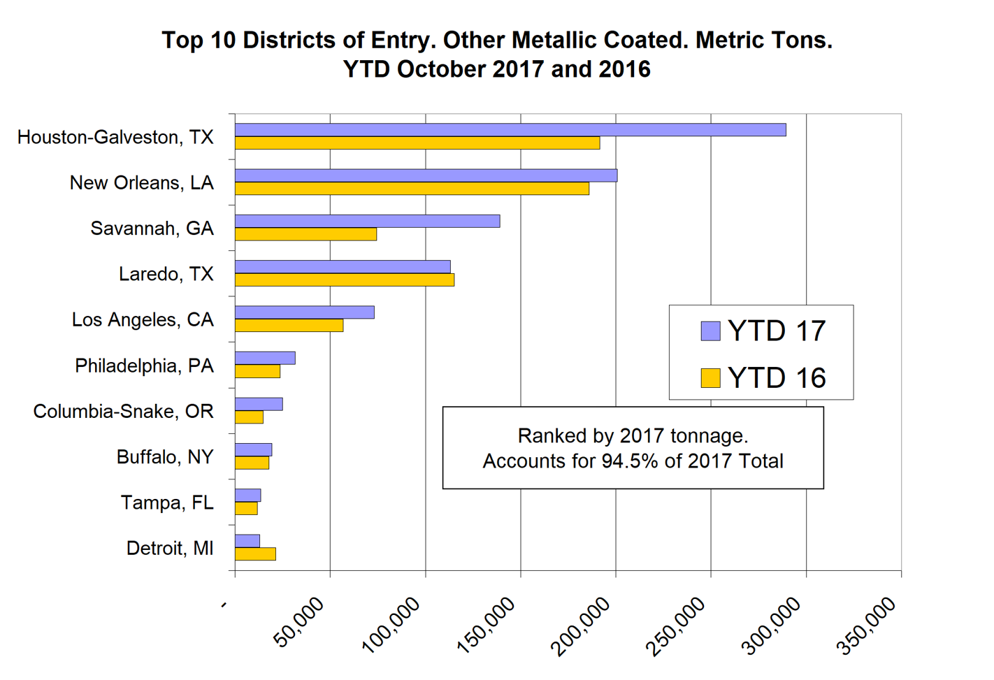 The table included here is a small part of the detailed analysis of other metallic coated tonnage. The bar graph shows the tonnage that entered the top 10 districts in YTD October for 2016 and 2017 ranked by 2017 tonnage. These 10 districts account for 94.5 percent of the grand total in 2017. Houston received the most tonnage through October 2017 followed by New Orleans, Savannah and Laredo.