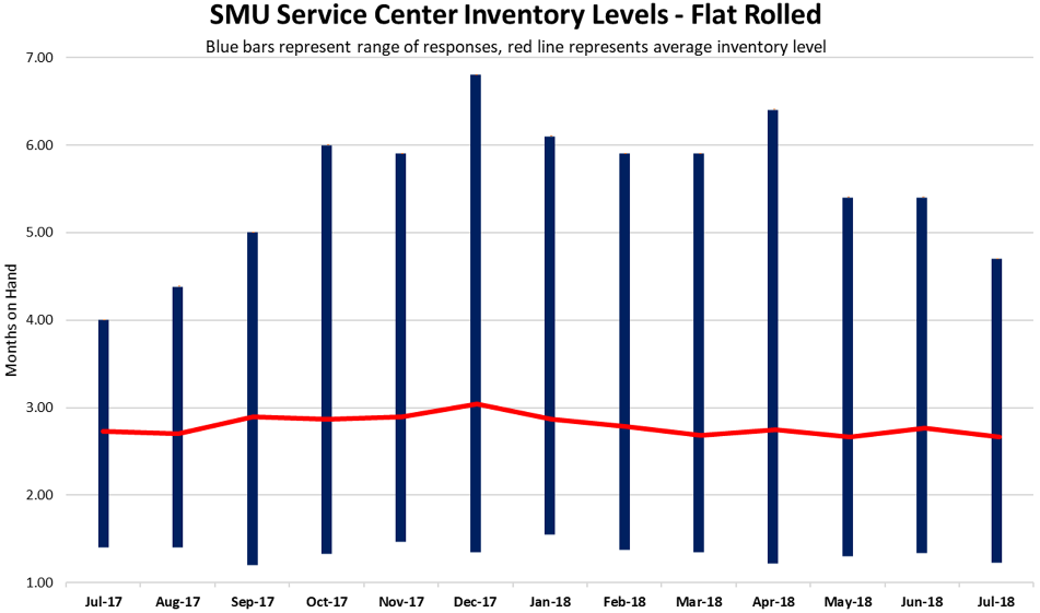 We found that 46 percent of those responding to our queries regarding July inventories reported lower inventories than the prior month. SMU saw 41 percent reporting inventories of flat rolled as being the same, and the balance (13 percent) reporting inventories as being higher.