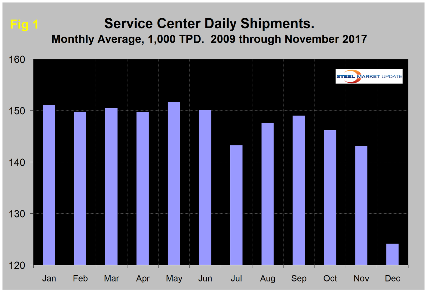 Service center shipments in November declined by 2.5 percent, close to the normal seasonal change for this time of year, according to Steel Market Update’s analysis of Metals Service Center Institute data.