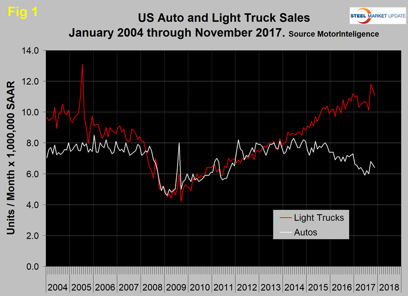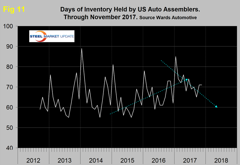 Ward’s Automotive reported this week that total light vehicle inventories in the U.S. were 71 days at the end of November, unchanged from the end of October. Month over month, FCA’s inventory increased from 85 to 88 days, GM was up from 80 to 83 days and Ford was down from 79 to 78 days. To put those results into perspective, Toyota was up from 58 to 59 days. Figure 11 shows that in 2017, in spite of the October/November increase, the auto companies have reversed a two-year trend of rising inventories.
