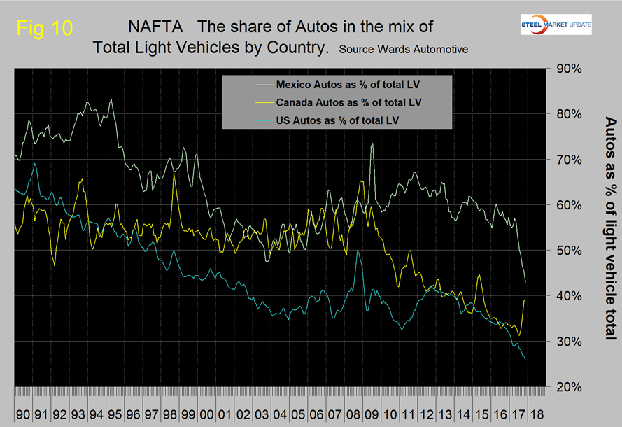 Figure 10 shows that the percentage of autos in the light vehicle mix has been declining for all three countries since 2012, though Canada has had a recent resurgence and Mexico has moved much more intensively into light trucks. In general, car sales–including four-door sedans, two-door coupes, station wagons and hatchbacks–continue to substantially underperform their SUV, crossover, and pickup truck counterparts.