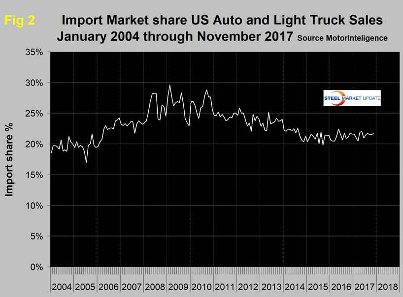Figure 1 shows auto and light truck sales since January 2004. Import market share at 21.7 percent in November was up from 21.5 percent in October, but has changed little in the last 18 months as shown in Figure 2.