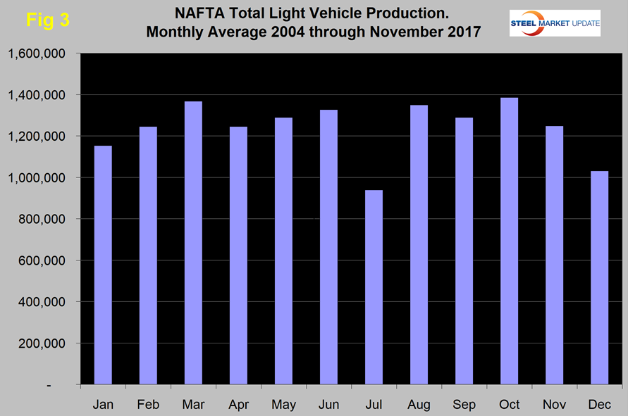 Total light vehicle (LV) production in NAFTA in November hit an annual rate of 17.19 million units, down from 17.26 million in October. On average since 2004, November’s production has declined by 9.9 percent from October. This year, production was down by 5.2 percent, therefore stronger than normal (Figure 3). Year to date through November 2017, production was down by 4.0 percent from the first 11 months of 2016. Note that production numbers are not seasonally adjusted; the sales data reported above are seasonally adjusted.
