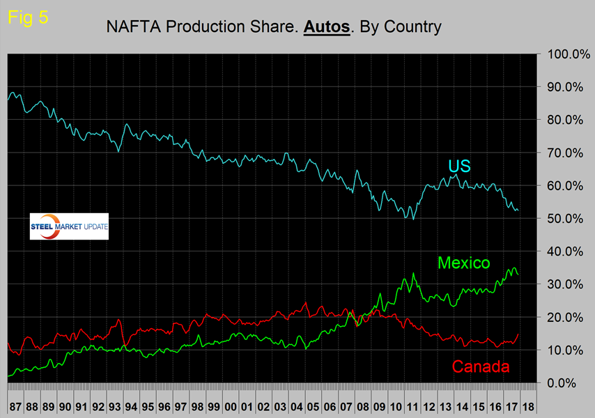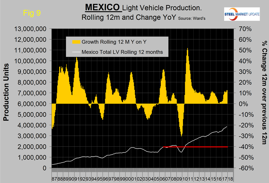 Figures 7, 8 and 9 show total LV production by country. The brown bars are the respective growth rates and this tells the whole story. The red line on each chart shows the change in production since Q2 2006. Note the scales are the same to give true comparability and that Mexican growth has surged in 2017. In November 2017, FCA (Fiat Chrysler Automotive) produced zero cars in either the U.S. or Mexico. Toyota produced the most cars in the U.S., closely followed by GM and Ford. Ford, GM and FCA, in that order, had the highest volume of light trucks in the U.S. Nissan produced by far the most cars in Mexico in November at 48,045, which was more than twice as many as Ford, which was in second place. Mexico currently exports about 80 percent of its LV production. The U.S. and Canada are the top two destinations with 61.5 percent and 7 percent of the total, respectively.