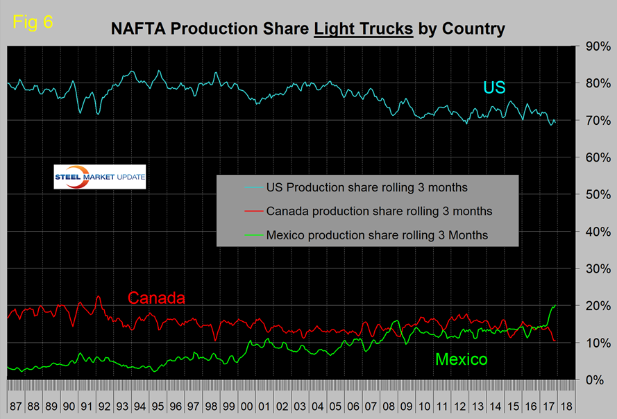 North America is experiencing a huge shift in assembly volume of both autos and light trucks from both the U.S. and Canada to Mexico. The shift south of the border is illustrated in Figures 5 and 6, which show production share for autos and light trucks, respectively. The Mexican light vehicle production target for 2020 is 5.0 million units, according to Eduardo Solis, president of the Mexican Automotive Industry Association. At this rate, Mexico will exceed Sr. Solis’ target.