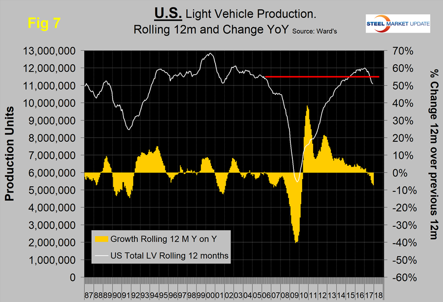 On a rolling 12-months basis year-over-year, total light vehicle production in the U.S. declined by 7.2 percent, Canada declined by 8.3 percent and Mexico was up by 12.4 percent. The comparison is worse for the U.S. and Canada comparing the latest three months when the results are: U.S. down by 10.8 percent, Canada down by 16.9 percent and Mexico up by 11.2 percent (Table 1).