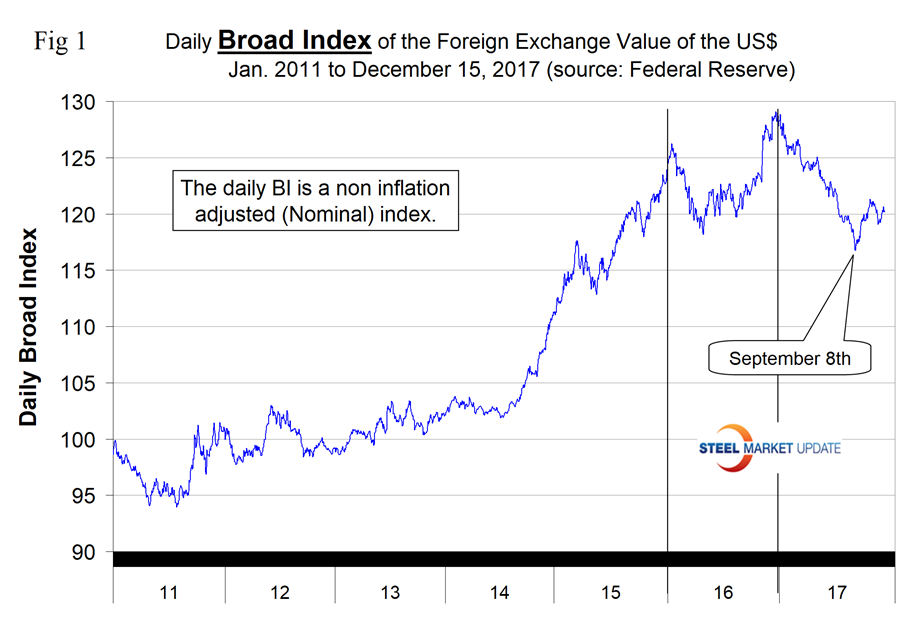 Explanation of Data Sources: The broad index is published by the Federal Reserve on both a daily and monthly basis. It is a weighted average of the foreign exchange values of the U.S. dollar against the currencies of a large group of major U.S. trading partners. The index weights, which change over time, are derived from U.S. export shares and from U.S. and foreign import shares. The data are noon buying rates in New York for cable transfers payable in the listed currencies. At SMU, we use the historical exchange rates published in the Oanda Forex trading platform to track the currency value of the U.S. dollar against that of 16 steel and iron ore trading nations. Oanda operates within the guidelines of six major regulatory authorities around the world and provides access to over 70 currency pairs. Approximately $4 trillion U.S. dollars are traded every day on foreign exchange markets.