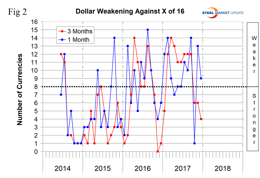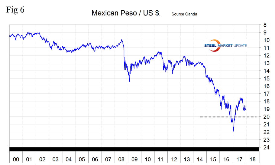 The Mexican Peso: Figure 6 shows the relationship between the peso and the U.S. dollar. The peso has declined by 7.5 percent in the last three months as the Canadian dollar has declined by 5.0 percent. Both these currencies are being negatively impacted by the NAFTA negotiations. Mexico was the 5th highest volume importer of steel products into the U.S in the 11 months through November 2017. Canada had the highest volume.