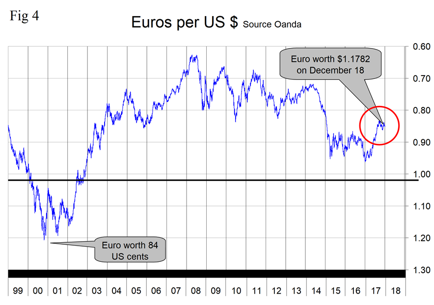 On Dec. 18, the euro was worth 1.1782 U.S. dollars. On Dec. 17, currency analyst Kenny Fisher wrote: “The euro has steadied in the Friday session after losing ground on Thursday following the ECB rate announcement. Currently, EUR/USD is trading at 1.1796, up 0.15% on the day. After a busy week with rate announcements from the Federal and the ECB, Friday is a light day. The sole euro-zone event, Trade Balance, looked weak as the trade surplus fell to EUR 19.0 billion, well off the estimate of EUR 24.4 billion. This marked a 3-month low. With the markets expecting the ECB to maintain rates at a flat 0.00%, investors were more interested in follow-up comments from ECB President Mario Draghi. In his press conference, Draghi sounded optimistic about economic conditions in the euro-zone, noting that ECB projections were ‘going in the right direction.’ Still, there was a caveat, as Draghi added that ‘an ample degree of monetary stimulus remains necessary.’ The ECB raised its forecasts for growth and inflation, but this clearly wasn’t enough to coax the cautious Draghi to signal another taper of the Bank’s ultra-loose stimulus program. Some policy makers favored signaling a change in policy if inflation continues to move higher, but the majority favored staying the course, which means the ECB will continue buying bonds till September 2018 (or later) and will keep interest rates at record lows even lower.”
