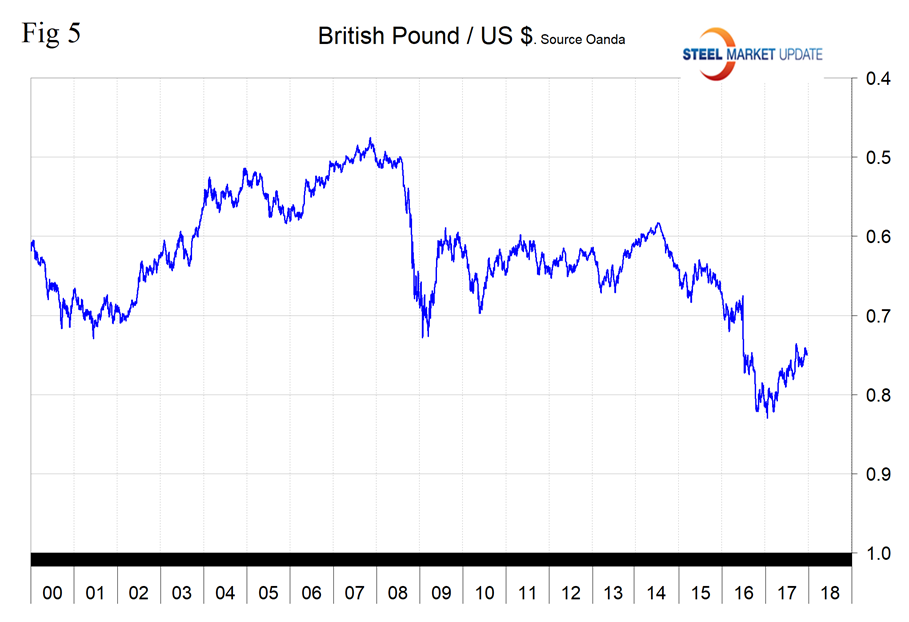The UK Pound: Figure 5 shows the relationship between the UK pound and the U.S. dollar. On Dec. 18, the pound was worth 1.3366 U.S. dollars and has risen by 8.25 percent since Jan. 1, 2017. In this writer’s opinion, the future of the pound is dismal as the prospects of a soft Brexit evaporate. The UK was the 13th highest volume importer of steel products into the U.S in the 11 months through November 2017.
