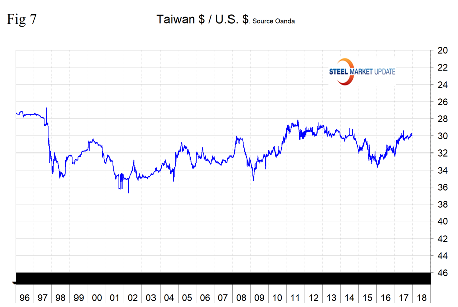The Taiwanese Dollar: Figure 7 shows the relationship between the Tai dollar and the U.S. dollar. The Tai dollar was one of only four of the steel trading nations’ currencies to strengthen in the last three months, moving up by 0.3 percent. Taiwan was the 8th highest volume importer of steel products into the U.S in the 11 months through November 2017.
