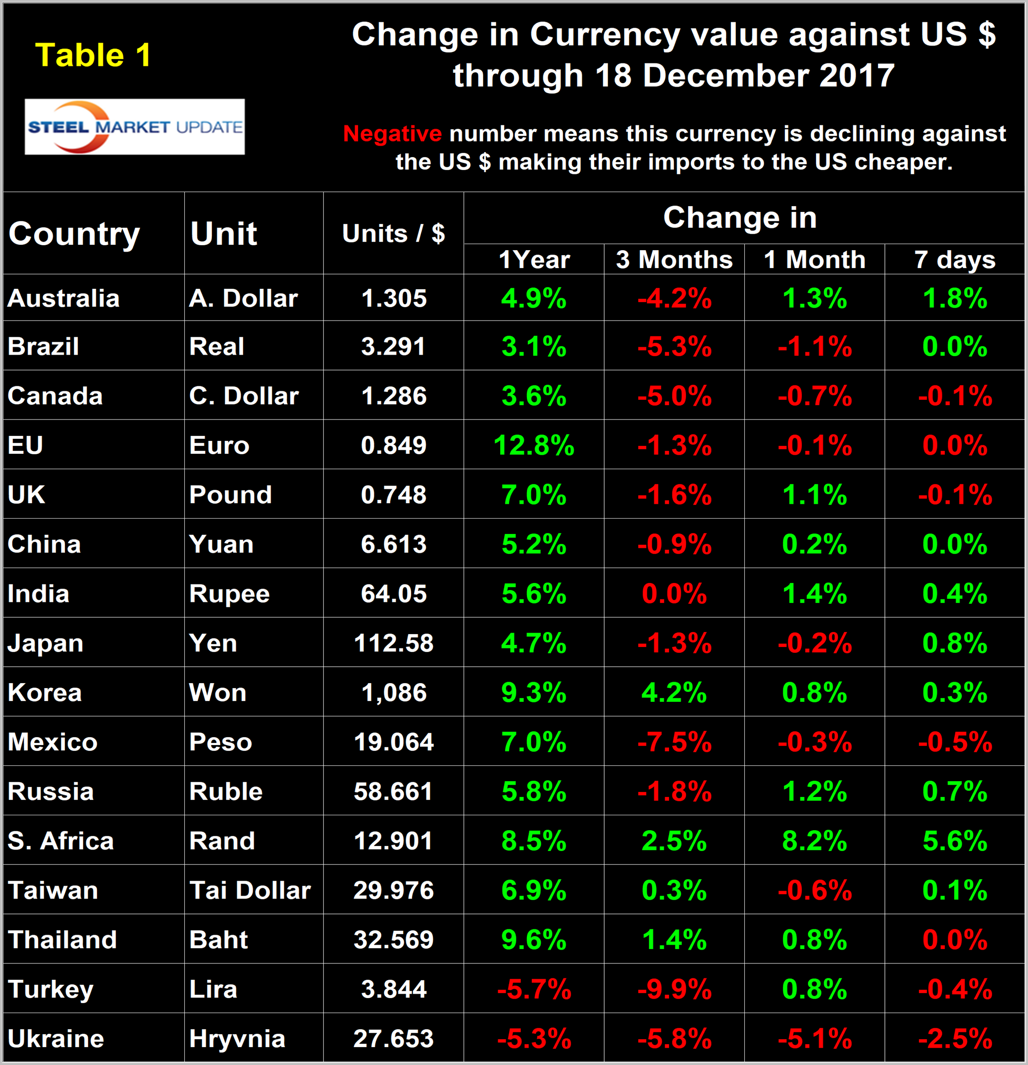 Each month, we publish an update of Table 1, which shows the value of the U.S. dollar against the currencies of 16 major global steel and iron ore trading nations.