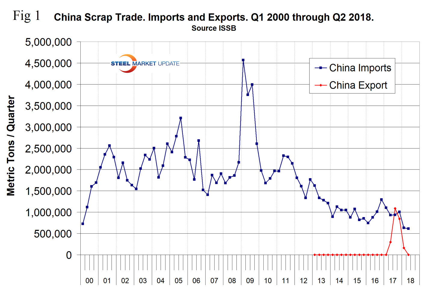 China became a net scrap exporter in the third quarter of 2017, according to Chinese trade administration data. In our global scrap trade analysis for Q3 2017, we stated: “By the end of this decade, we expect a huge disruption of the global scrap market as China’s scrap collection industry catches up with the rate of scrap generation. About 93 percent of China’s steel is currently manufactured in basic oxygen furnaces. Therefore, until they evolve an appropriate mix of BOF/EAF capacity, scrap will be exported in huge volumes.” When data was released for Q4 2017 and then for Q1 2018, we were surprised to see that our conclusion seemed to be premature because China’s reported scrap exports declined by 23 percent and then by another 80 percent. We now have data for Q2 2018 when China’s reported scrap exports were zero (Figure 1).