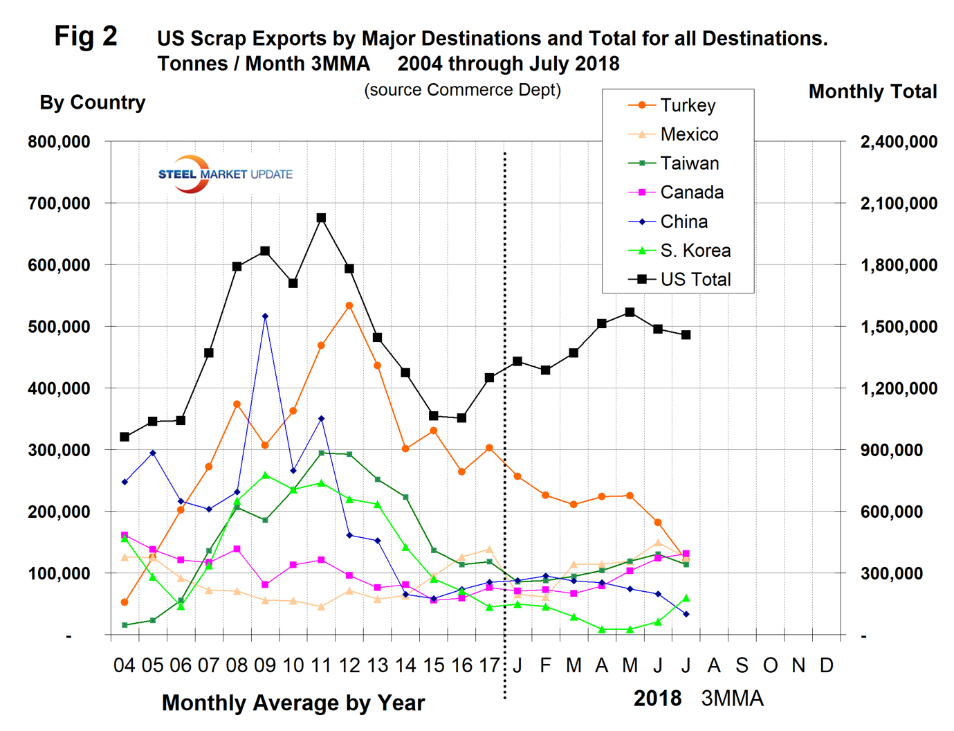 Figure 2 shows total scrap exports from the U.S. as reported by the U.S. Department of Commerce on the right axis together with the major destinations reported on the left axis. It shows the monthly average for the years 2004 through 2017 and the three-month moving average for January through July 2018. In the 12 months of 2017, U.S. scrap exports increased by 18.6 percent from the same period in 2016. In 2018 year to date, July scrap exports were up by 25.7 percent and are now back to where they were in 2013.