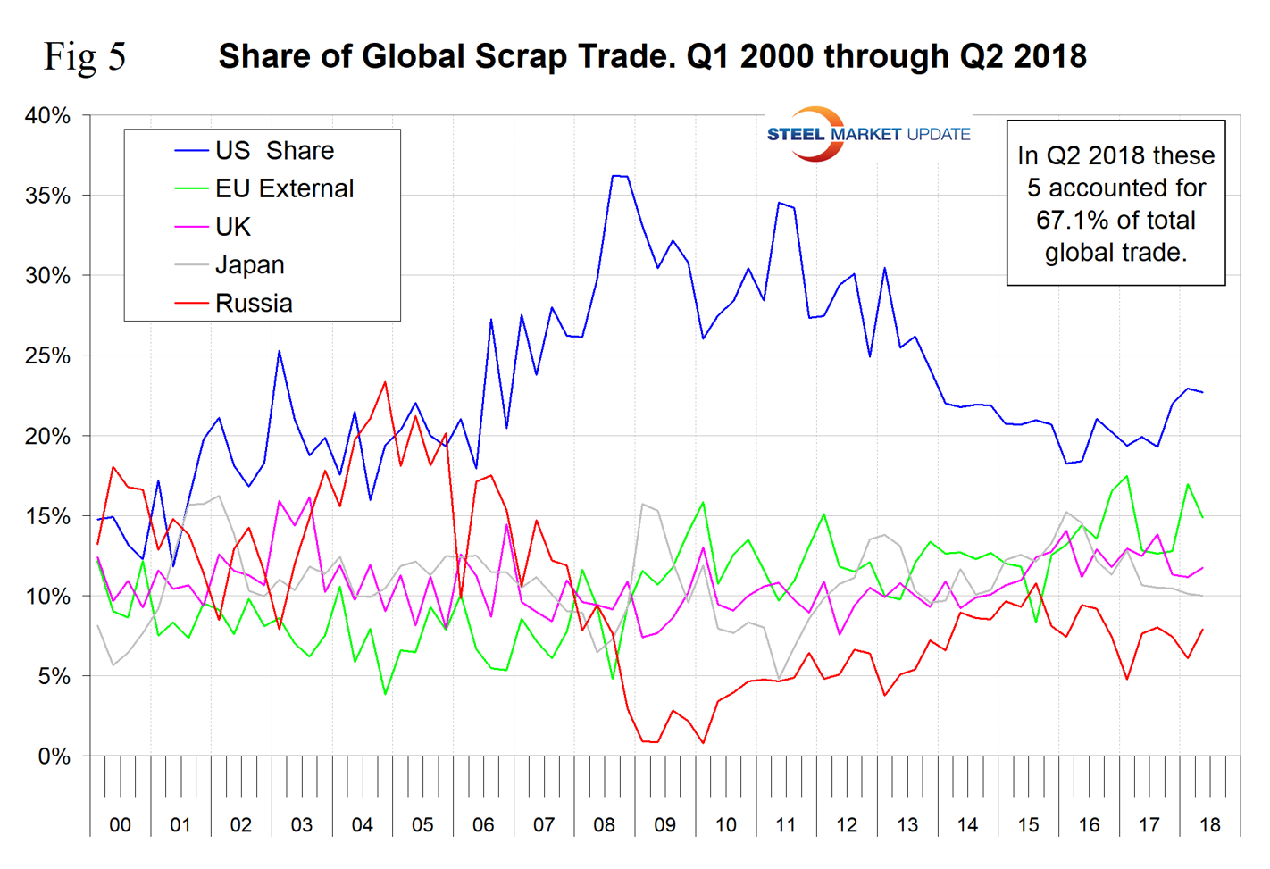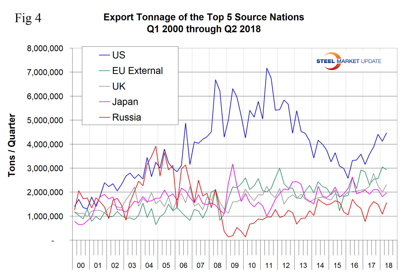 In our analysis of global scrap trade, we have excluded scrap that moved within the EU from the global total. Figures 3 and 4 show the total tonnage of global trade since Q1 2000 and the volume of the top five suppliers. These five are the U.S., the EU, the UK, Japan and Russia, and they accounted for 67.1 percent of the total in Q2 2018. Figure 4 is the same as Figure 3 with the total removed.
