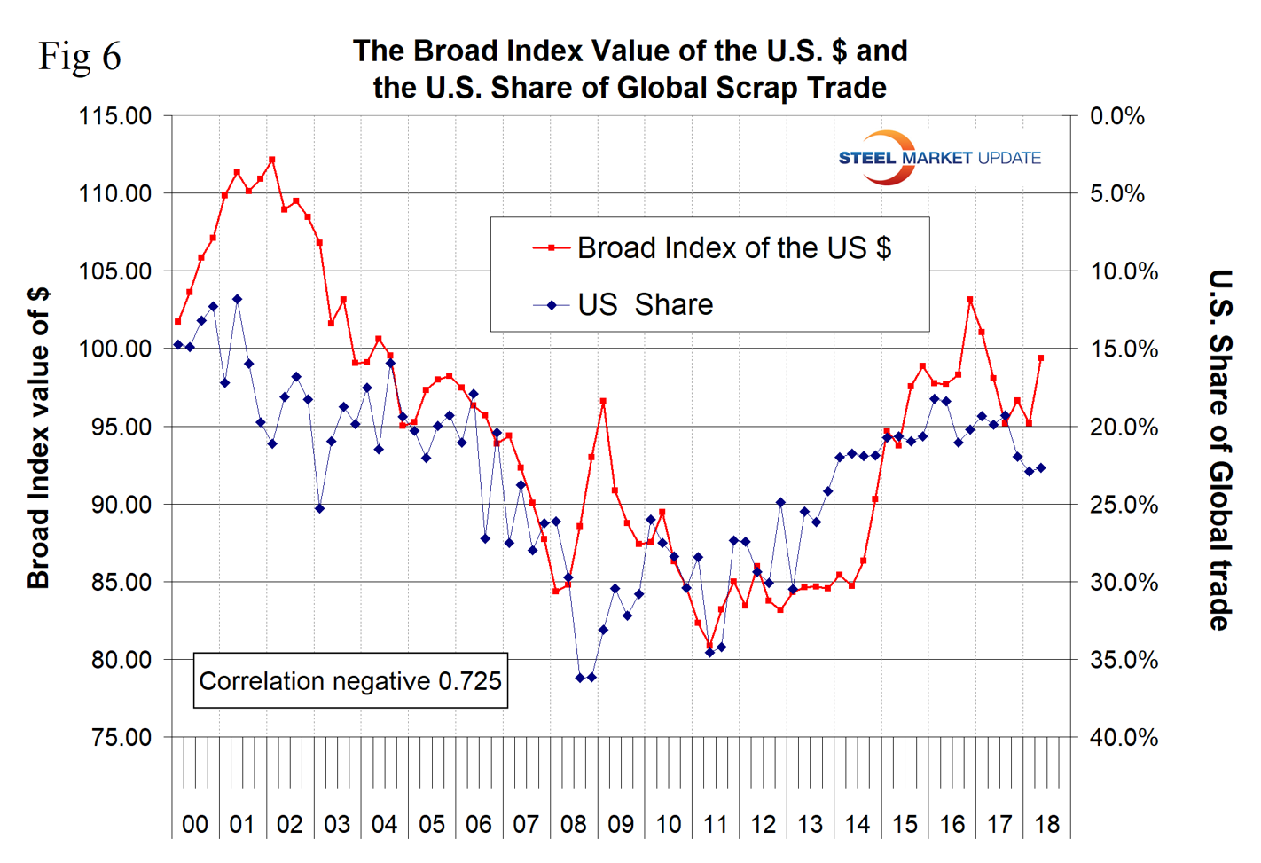 Figure 6 shows the negative correlation of 72.5 percent between the Broad Index value of the U.S. dollar and the U.S. share of global trade. There is also a correlation between the U.S. global share and the U.S. domestic scrap price. The result is shown in Figure 7 with a correlation of 64.5 percent. The fact that our export share increases as our domestic price increases might seem backwards at first glance. However, scrap is a global commodity and this would seem to support the view that the domestic price is driven more by export volume than by domestic demand.