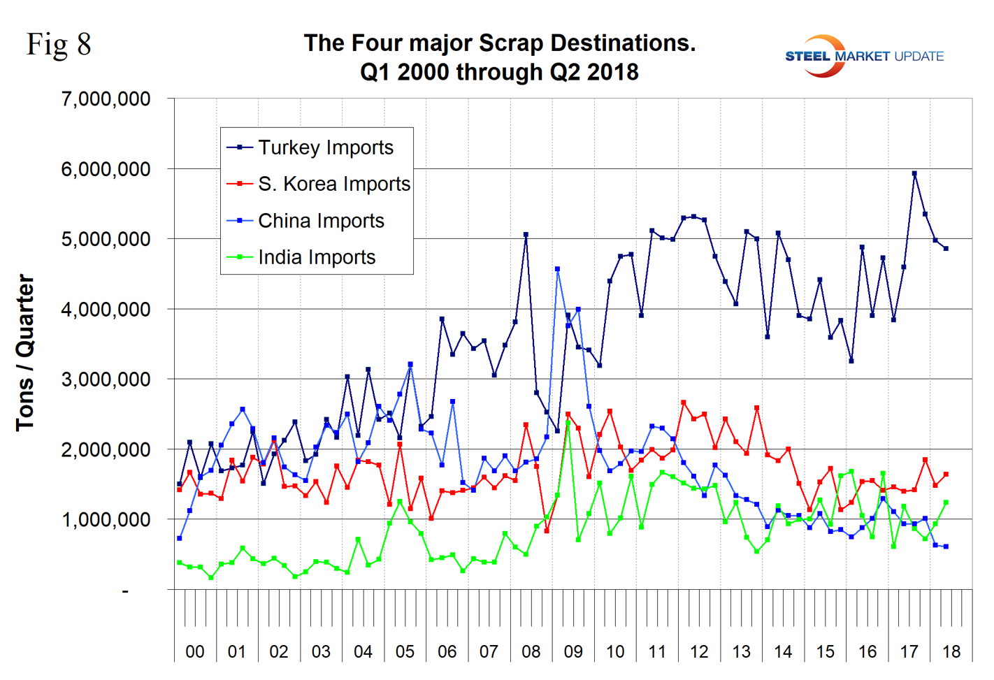 Figure 8 shows the tonnage received by the four major importing nations. Turkey is by far the largest global scrap buyer with a tonnage totaling more than the other three combined. In Q2 2018, Turkey took in 24.6 percent of the global total.